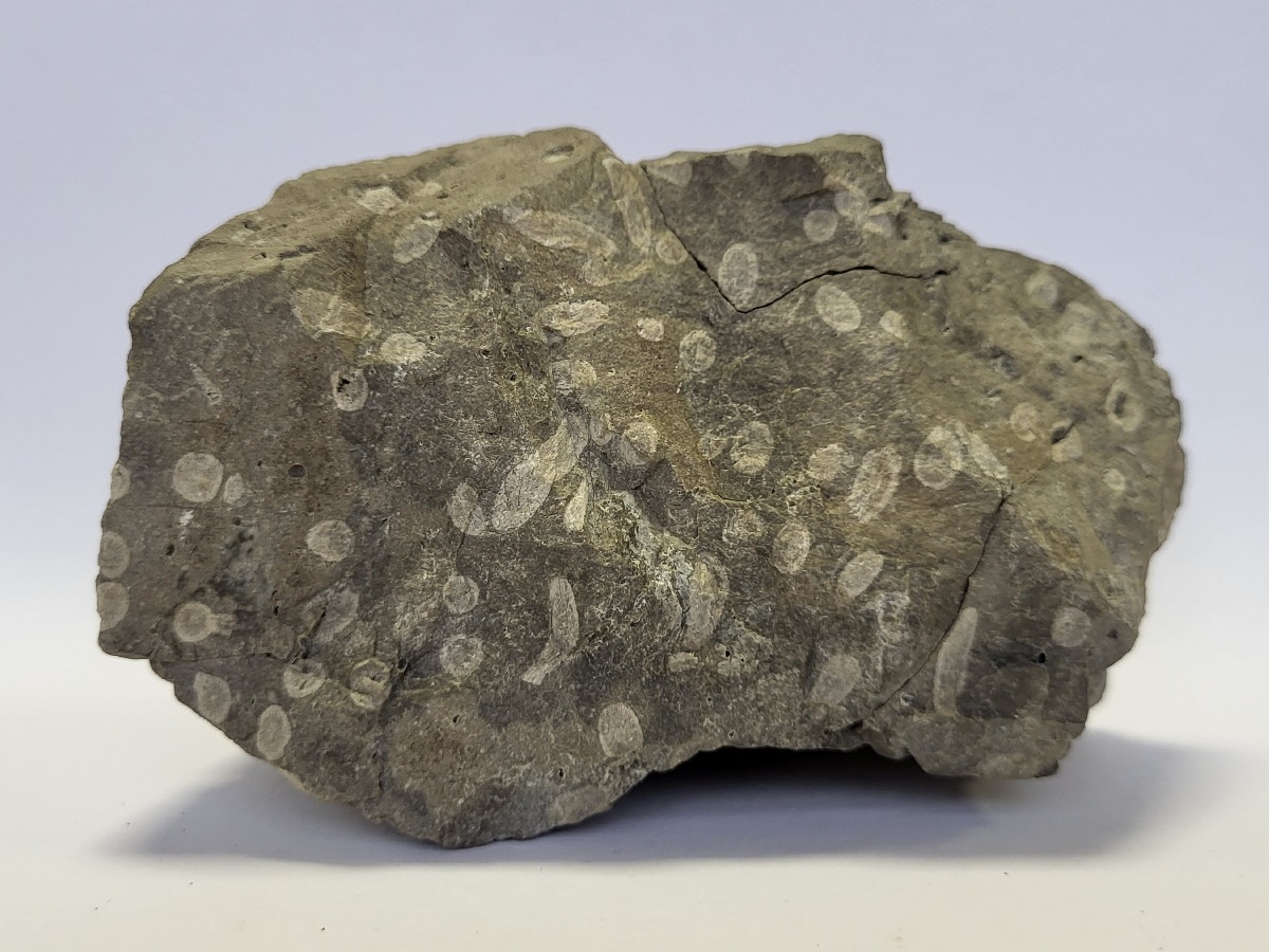 Kalcijev karbonat CaCO₃ prošaran fosiliziranim ostacima koralja Waagenophyllum sp.